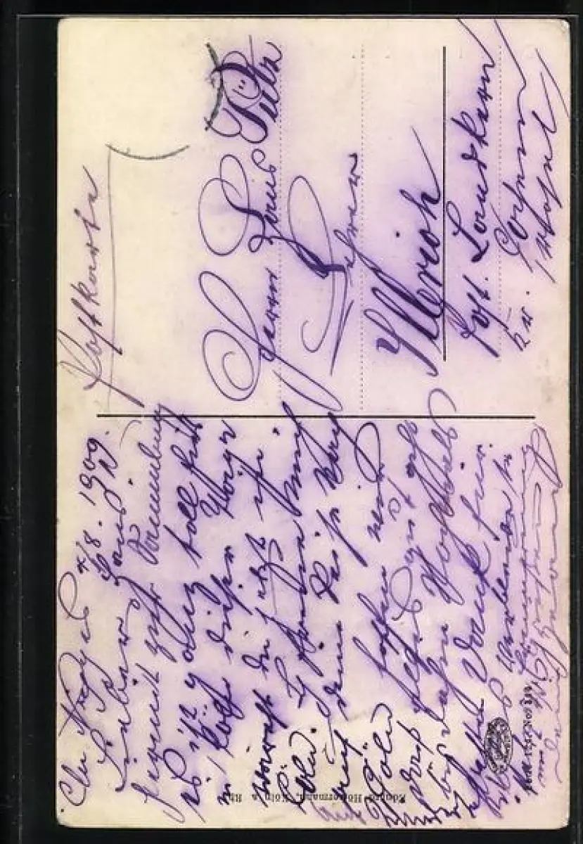 Personenbezogene Daten auf der Rückseite der Karte wurden durch blauen Textmarker unkenntlich gemacht. Die blauen Stellen sind auf die Vorderseite durchgeweicht und wirken sich negativ auf das Postkartenfoto aus