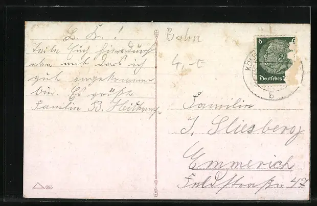Personenbezogene Daten auf der Rückseite der Karte wurden durch blauen Textmarker unkenntlich gemacht. Die blauen Stellen sind auf die Vorderseite durchgeweicht und wirken sich negativ auf das Postkartenfoto aus