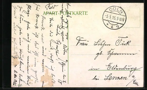 gelaufen 1915 als Feldpost, Stempelspur, guter Zustand
