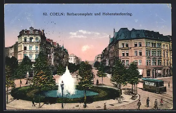 AK Köln-Neustadt, Barbarossaplatz und Hohenstaufenring mit Zigarrengeschäft und Fontäne, Strassenbahn