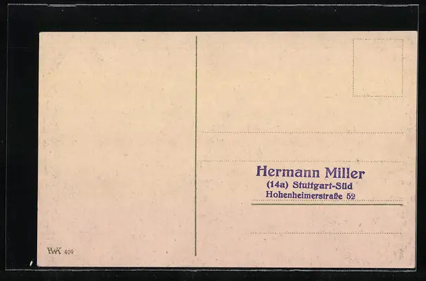 Personenbezogene Daten auf der Rückseite der Karte wurden durch blauen Textmarker unkenntlich gemacht. Die blauen Stellen sind auf die Vorderseite durchgeweicht und wirken sich negativ auf das Postkartenfoto aus