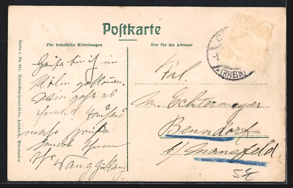 Personenbezogene Daten auf der Rückseite der Karte wurden durch blauen Textmarker unkenntlich gemacht. Die blauen Stellen sind auf die Vorderseite durchgeweicht und wirken sich negativ auf das Postkartenfoto aus