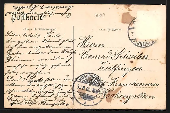 alte Ansichtskarte, gelaufen 1905, Briefmarke entfernt, rückseitig Oberflächenschaden, guter Zustand