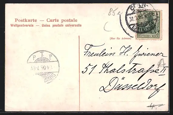 gelaufen 1906, Eckknicke re. unten, guter Zustand