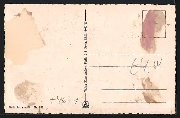alte Ansichtskarte, ungelaufen, rückseitig Klebe- und Papierreste, rückseitig Oberflächenschaden, guter Zustand