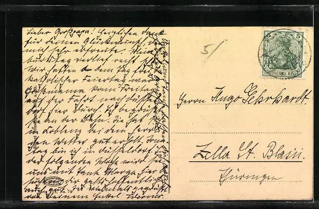 Personenbezogene Daten auf der Rückseite der Karte wurden durch blauen Textmarker unkenntlich gemacht. Die blauen Stellen sind auf die Vorderseite durchgeweicht und wirken sich negativ auf das Postkartenfoto aus