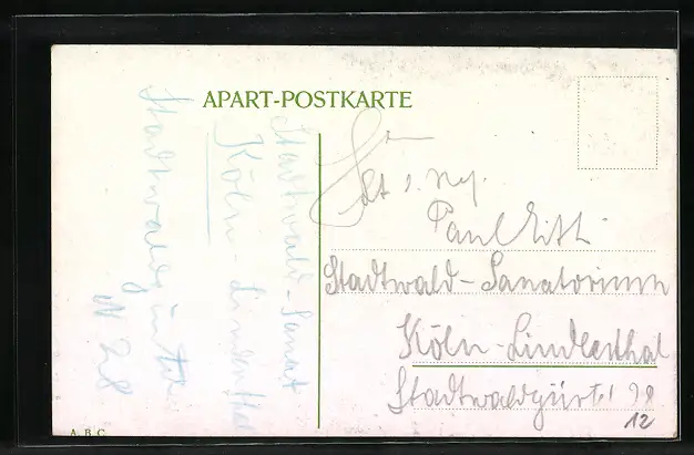 Personenbezogene Daten auf der Rückseite der Karte wurden durch blauen Textmarker unkenntlich gemacht. Die blauen Stellen sind auf die Vorderseite durchgeweicht und wirken sich negativ auf das Postkartenfoto aus