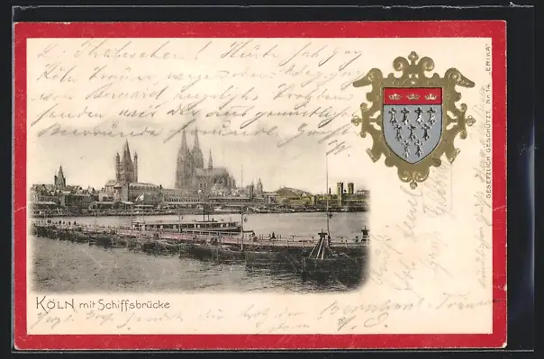 AK Köln, Ortsansicht mit Schiffsbrücke, Wappen
