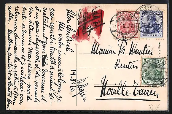 Personenbezogene Daten auf der Rückseite der Karte wurden durch blauen Textmarker unkenntlich gemacht. Die blauen Stellen sind auf die Vorderseite durchgeweicht und wirken sich negativ auf das Postkartenfoto aus