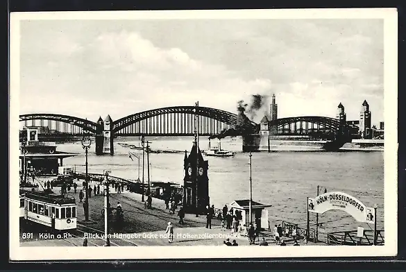 AK Köln /Rh., Blick von Hängebrücke nach Hohenzollernbrücke