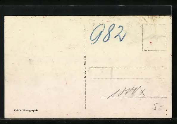 Personenbezogene Daten auf der Rückseite der Karte wurden durch blauen Textmarker unkenntlich gemacht. Die blauen Stellen sind auf die Vorderseite durchgeweicht und wirken sich negativ auf das Postkartenfoto aus