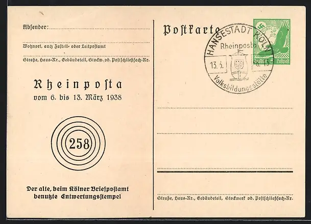 AK Köln, Rheinposta Ausstellung 1938, Ganzsache 5 Pf.