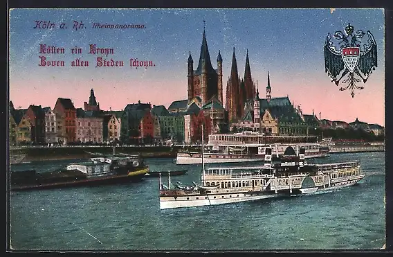AK Köln, Stadtwappen, Rheinpanorama, Rhein-Dampfer vor dem Dom