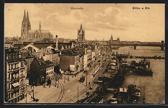 AK Köln, Strassenbahn am Rheinufer