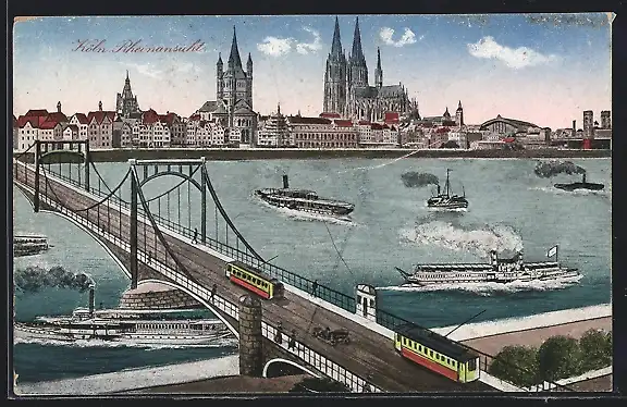 AK Köln, Strassenbahn auf Rheinbrücke, Dampfer