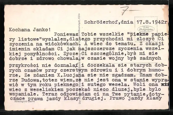 Personenbezogene Daten auf der Rückseite der Karte wurden durch blauen Textmarker unkenntlich gemacht. Die blauen Stellen sind auf die Vorderseite durchgeweicht und wirken sich negativ auf das Postkartenfoto aus