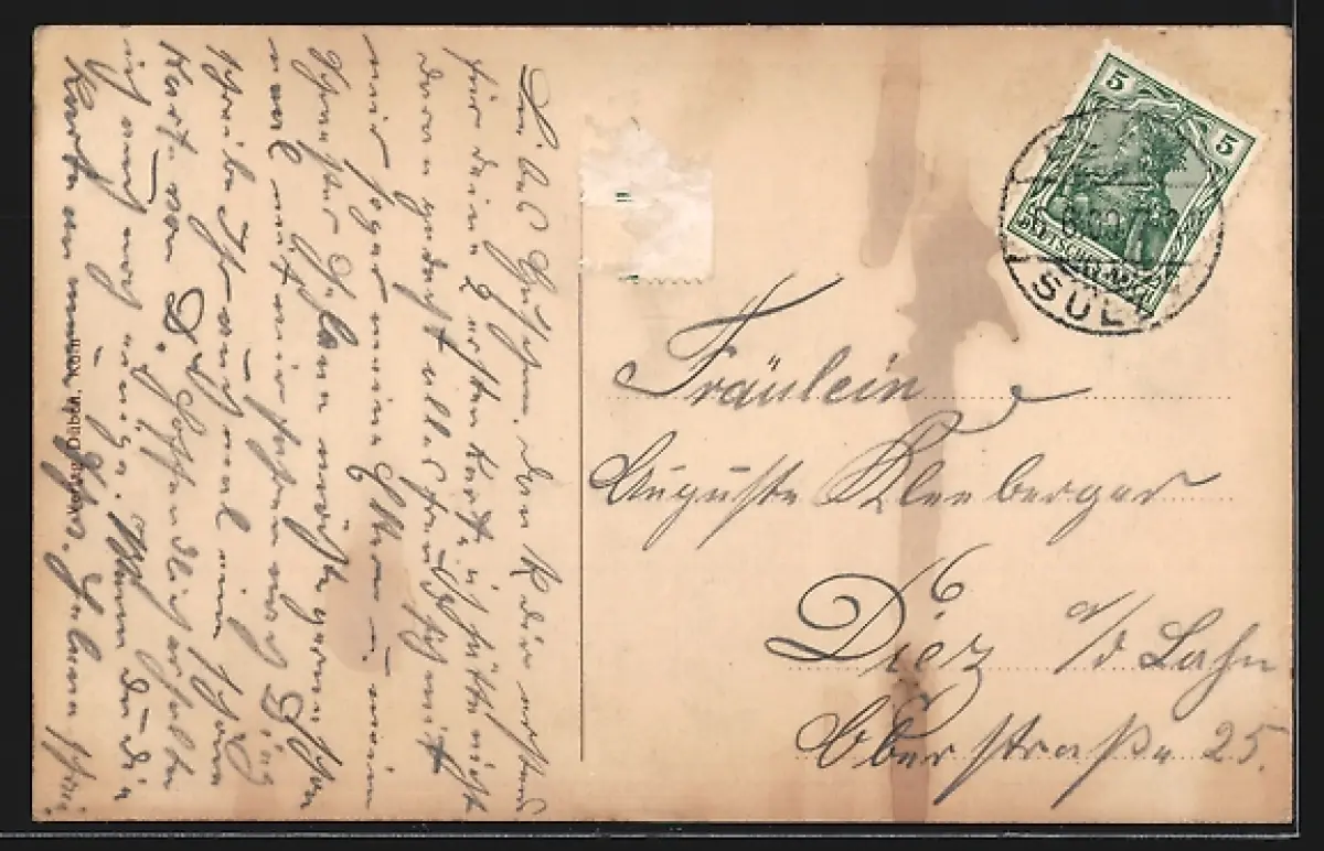 Personenbezogene Daten auf der Rückseite der Karte wurden durch blauen Textmarker unkenntlich gemacht. Die blauen Stellen sind auf die Vorderseite durchgeweicht und wirken sich negativ auf das Postkartenfoto aus