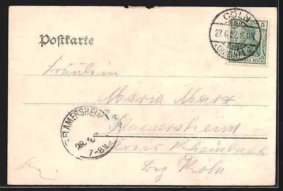 alte Ansichtskarte, gelaufen 1902, Kantenschaden oben mittig, guter Zustand