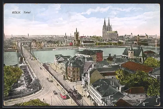 AK Köln, Totalansicht mit Rheinbrücke, Dom und Strassenbahn