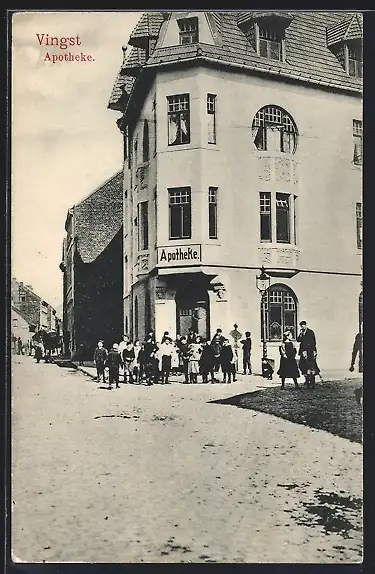 AK Köln-Vingst, Menschengruppe vor der Apotheke