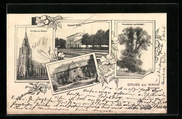 AK Köln-Wahn, Bahnhof, Kirche, Krausbaum am Kirchhof, Haus Wahn