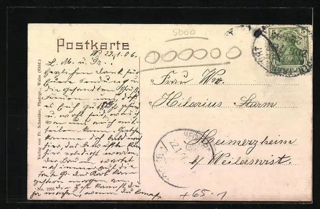 Personenbezogene Daten auf der Rückseite der Karte wurden durch blauen Textmarker unkenntlich gemacht. Die blauen Stellen sind auf die Vorderseite durchgeweicht und wirken sich negativ auf das Postkartenfoto aus