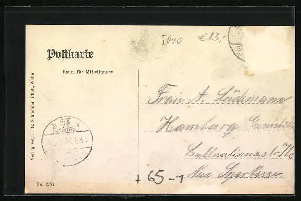 Personenbezogene Daten auf der Rückseite der Karte wurden durch blauen Textmarker unkenntlich gemacht. Die blauen Stellen sind auf die Vorderseite durchgeweicht und wirken sich negativ auf das Postkartenfoto aus