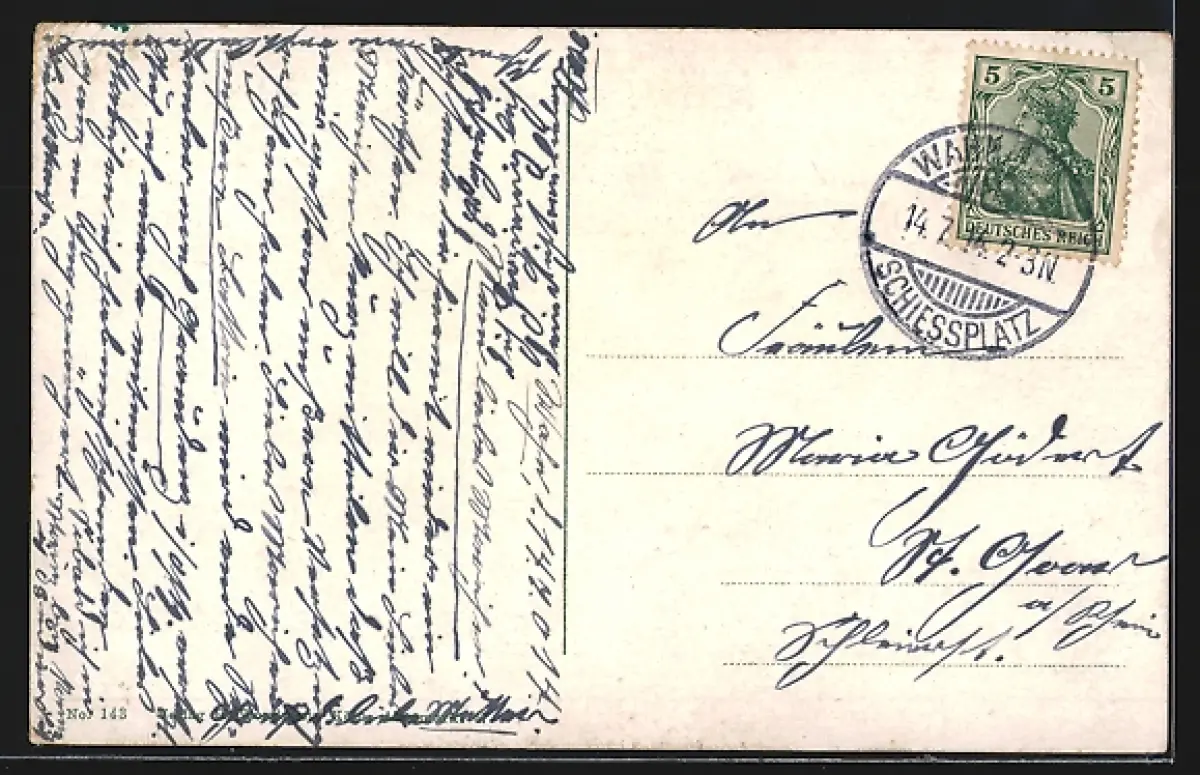 Personenbezogene Daten auf der Rückseite der Karte wurden durch blauen Textmarker unkenntlich gemacht. Die blauen Stellen sind auf die Vorderseite durchgeweicht und wirken sich negativ auf das Postkartenfoto aus