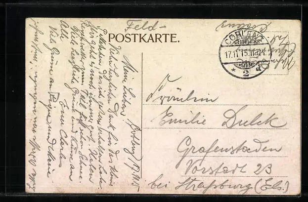 gelaufen als Feldpost 1915, Stempelspur, guter Zustand