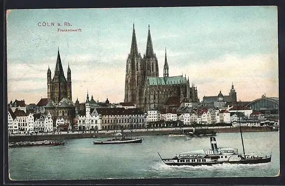 AK Köln a. Rh., Frankenwerft mit Dom und Dampfboot