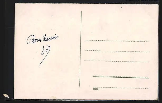 Personenbezogene Daten auf der Rückseite der Karte wurden durch blauen Textmarker unkenntlich gemacht. Die blauen Stellen sind auf die Vorderseite durchgeweicht und wirken sich negativ auf das Postkartenfoto aus