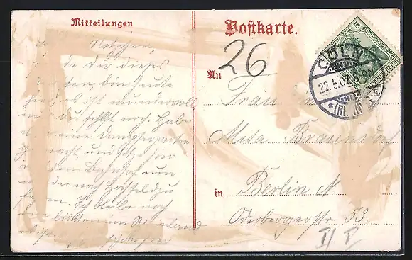 Personenbezogene Daten auf der Rückseite der Karte wurden durch blauen Textmarker unkenntlich gemacht. Die blauen Stellen sind auf die Vorderseite durchgeweicht und wirken sich negativ auf das Postkartenfoto aus
