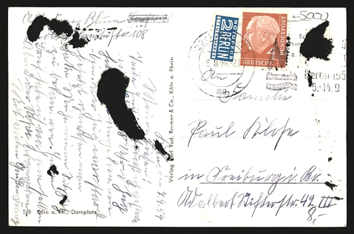 Personenbezogene Daten auf der Rückseite der Karte wurden durch blauen Textmarker unkenntlich gemacht. Die blauen Stellen sind auf die Vorderseite durchgeweicht und wirken sich negativ auf das Postkartenfoto aus