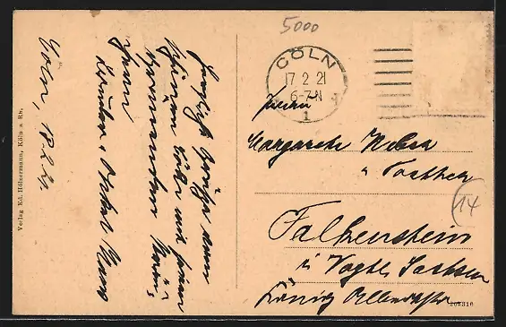 alte Ansichtskarte, gelaufen 1921, Briefmarke entfernt, guter Zustand