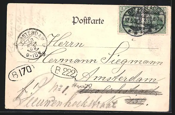 Personenbezogene Daten auf der Rückseite der Karte wurden durch blauen Textmarker unkenntlich gemacht. Die blauen Stellen sind auf die Vorderseite durchgeweicht und wirken sich negativ auf das Postkartenfoto aus