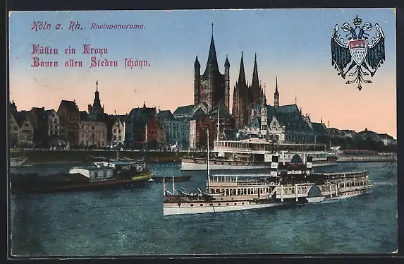 AK Köln a. Rh., Rheinpanorama mit Dampfern, Wappen