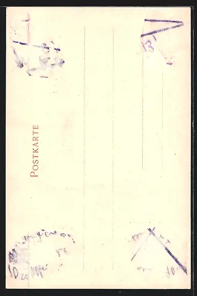 Personenbezogene Daten auf der Rückseite der Karte wurden durch blauen Textmarker unkenntlich gemacht. Die blauen Stellen sind auf die Vorderseite durchgeweicht und wirken sich negativ auf das Postkartenfoto aus