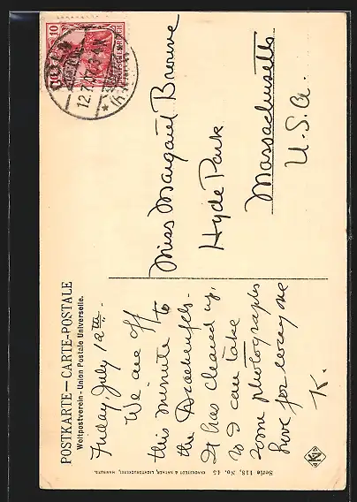 alte Ansichtskarte, gelaufen 1907, Eckknicke unten, Stempelspur, guter Zustand