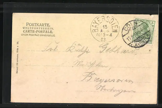 alte Ansichtskarte, gelaufen 1903, leichte Bugspuren links oben, guter Zustand