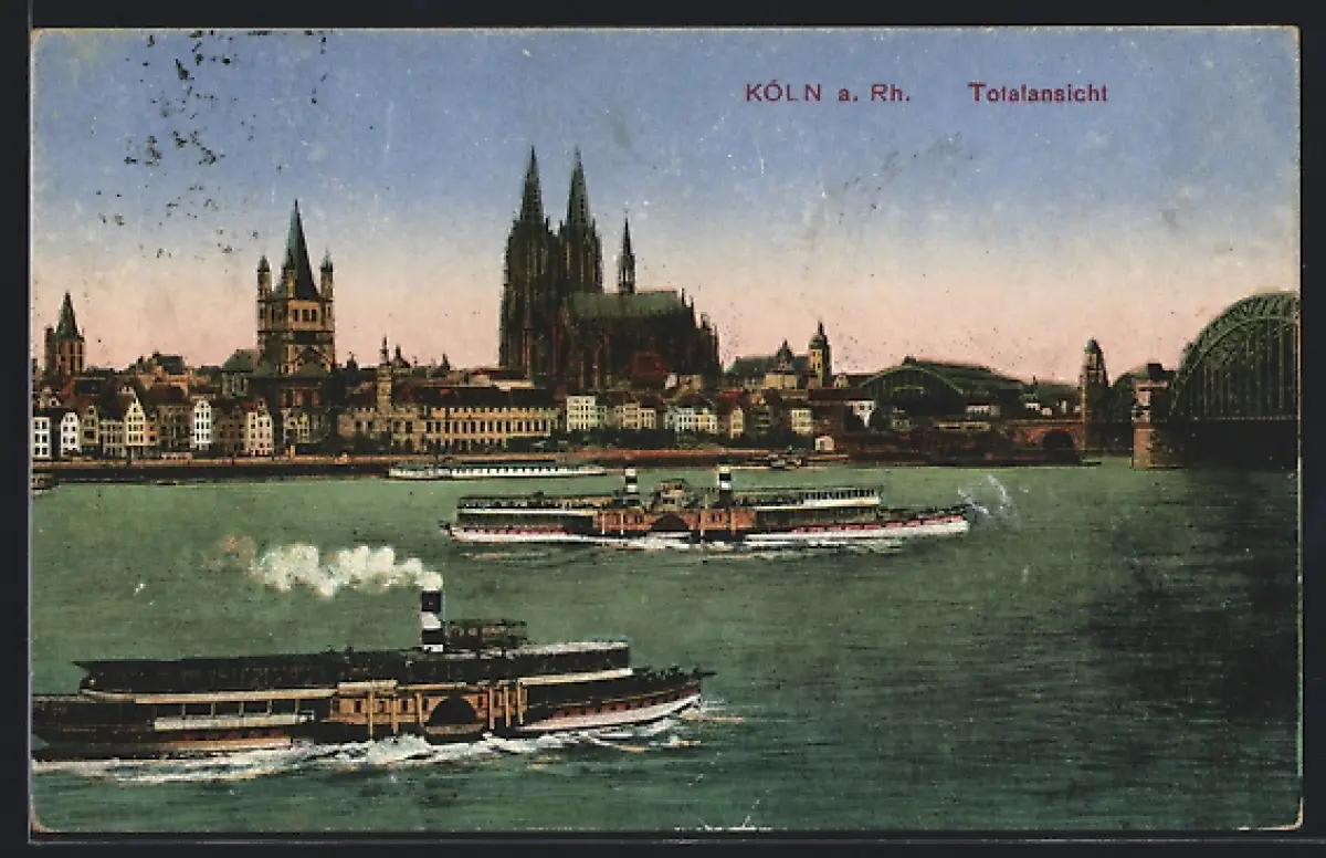 AK Köln a. Rh., Totalansicht, Rhein, Dampfschiffe, Dom