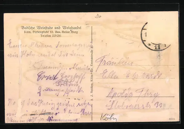alte Ansichtskarte, gelaufen, Briefmarke entfernt, rückseitig Oberflächenschaden, rückseitig Klebe- und Papierreste, guter Zustand