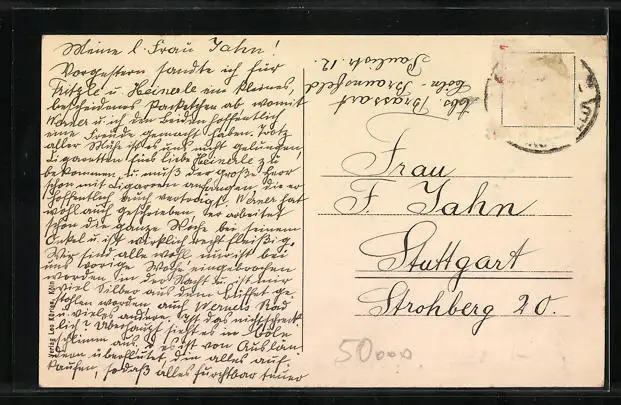 Personenbezogene Daten auf der Rückseite der Karte wurden durch blauen Textmarker unkenntlich gemacht. Die blauen Stellen sind auf die Vorderseite durchgeweicht und wirken sich negativ auf das Postkartenfoto aus