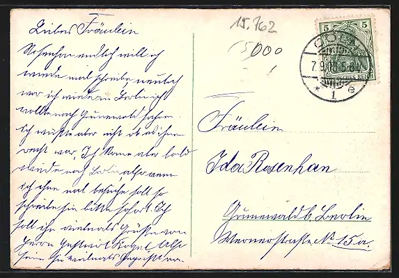 alte Ansichtskarte, gelaufen 1908, Eckknick li. unten, linke Kante beschnitten