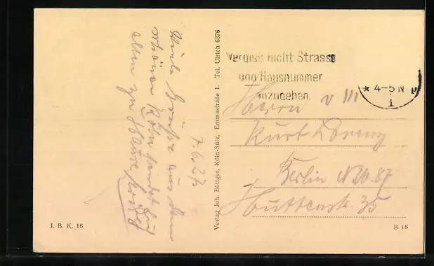 Personenbezogene Daten auf der Rückseite der Karte wurden durch blauen Textmarker unkenntlich gemacht. Die blauen Stellen sind auf die Vorderseite durchgeweicht und wirken sich negativ auf das Postkartenfoto aus