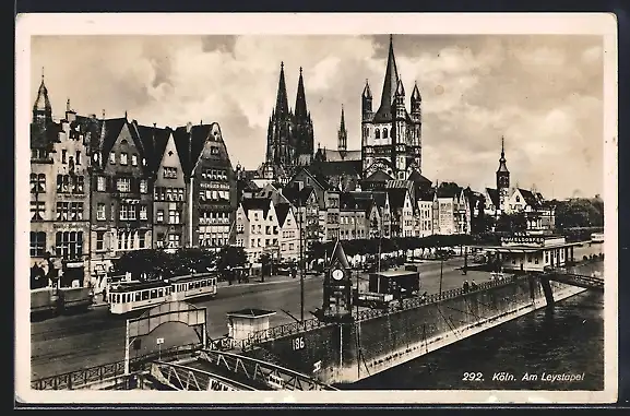 AK Köln am Rhein, eine Strassenbahn am Leystapel, Domblick