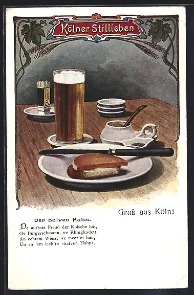 AK Kölner Stilleben, Der halven Hahn, Brot und Bier, Streichhölzer