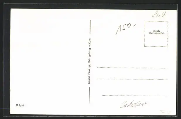 Personenbezogene Daten auf der Rückseite der Karte wurden durch blauen Textmarker unkenntlich gemacht. Die blauen Stellen sind auf die Vorderseite durchgeweicht und wirken sich negativ auf das Postkartenfoto aus