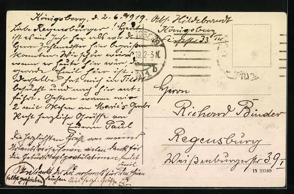 alte Ansichtskarte, gelaufen 1919, Briefmarke entfernt, guter Zustand