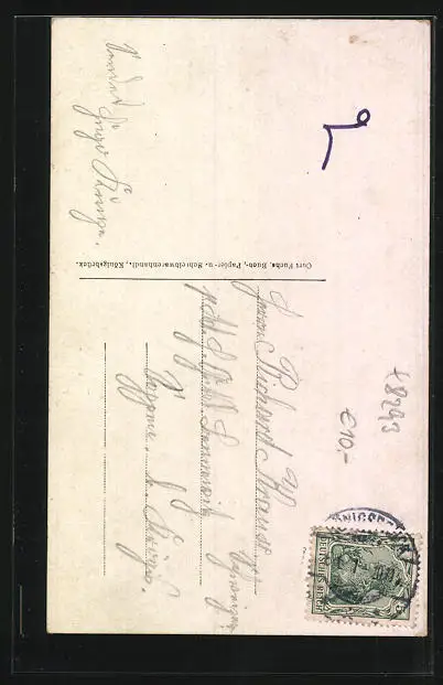 Personenbezogene Daten auf der Rückseite der Karte wurden durch blauen Textmarker unkenntlich gemacht. Die blauen Stellen sind auf die Vorderseite durchgeweicht und wirken sich negativ auf das Postkartenfoto aus