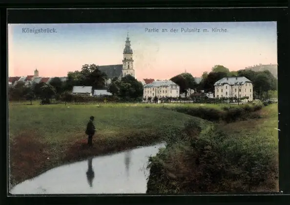AK Königsbrück, Partie an der Pulsnitz mit Kirche